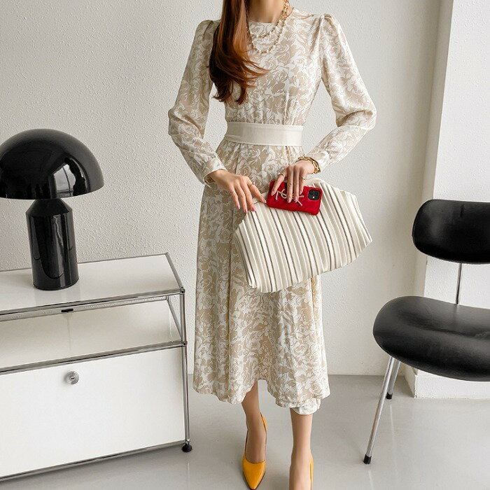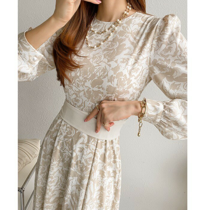 花柄ロングワンピース エレガント ウエストリボン フレアワンピ 長袖 記念日 謝恩会 食事会 デート きれいめ 大人女子 レディス 春コーデ 韓国女子 韓国ファッション 春ワンピース 春ワンピ レディース キレイめ 大人可愛い 可愛い ロングワンピ